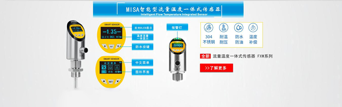 MS-FXG 流量溫度傳感器產(chǎn)品特點: 1、溫度和流量 一體式傳感器 2、自發(fā)光OLED;顯示清晰銳利 3、溫度智能顯示報警接點輸出 4、流量智能顯示報警接點輸出 5、中文+圖形界面;傻瓜式菜單 6、數(shù)字通信;模擬量一體式 7、精度高穩(wěn)定性好 8、耐結(jié)垢,耐腐蝕 8、全灌封設計全防水殼體 9、耐壓高、高壓型可耐壓10MPa 10、手機掃碼安裝指導功能;無需說明書在線工程師專業(yè)服務